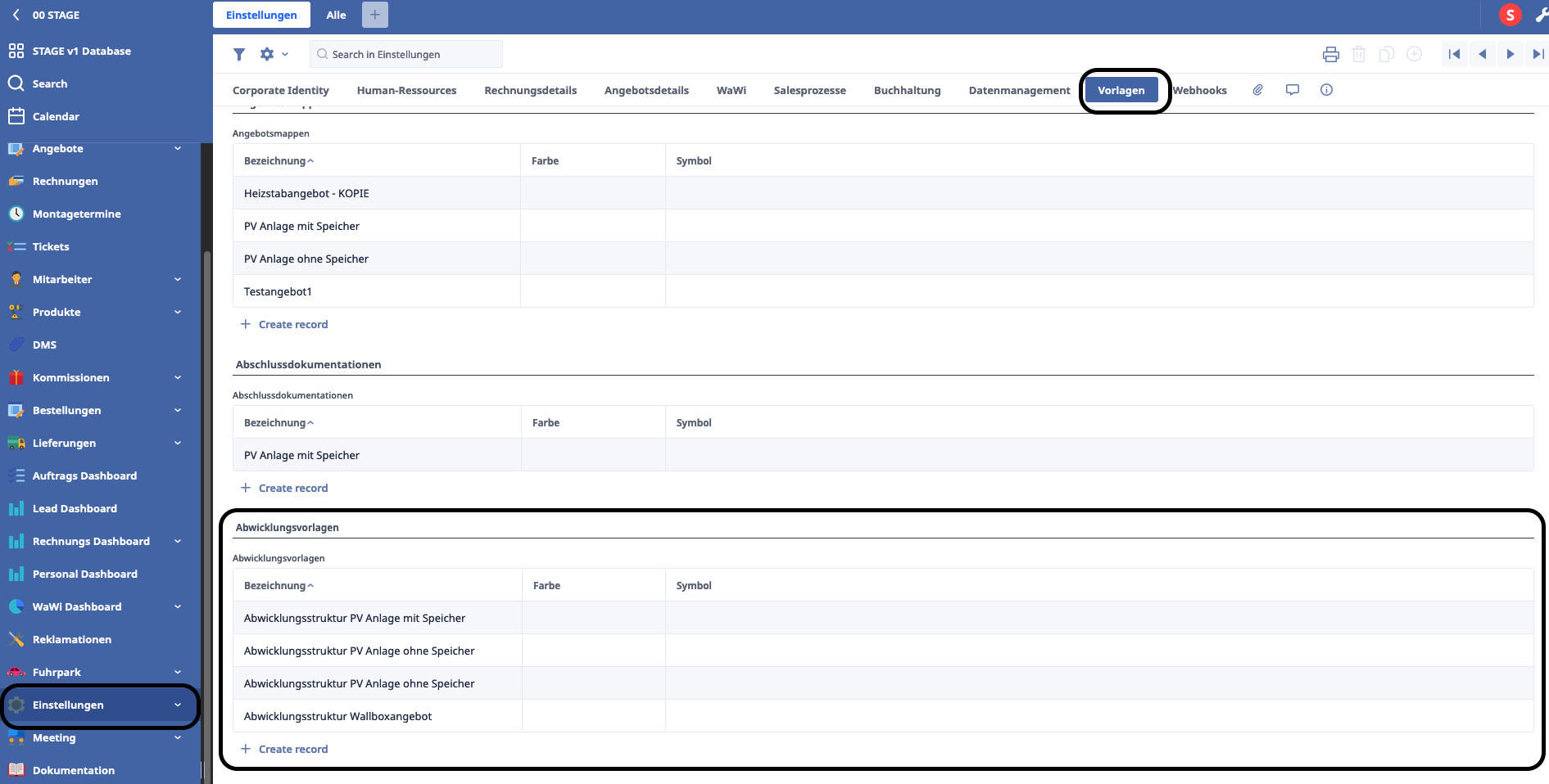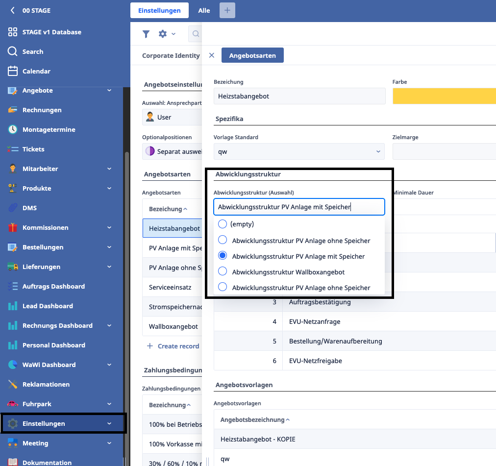 Unter Einstellungen -> Vorlagen ist es nun möglich Abwicklungsvorlagen zu erstellen. Diese Vorlagen können dann in den Angebotsarten über ein Dropdown Menü ausgewählt werden. Dies ermöglicht es eine Abwicklungsstruktur mit mehreren Angebotsarten zu verknüpfen, sodass nur eine Angebotsvorlagen bei Änderung angepasst werden muss.