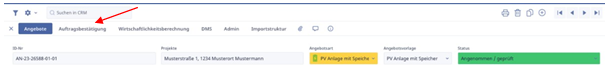 Wenn der Kunde das Angebot akzeptiert hat, können wir den Status in der Angebotsmaske von „Verschickt“ auf „Angenommen“ ändern. Dadurch wird der Karteireiter „Auftragsbestätigung“ sichtbar.