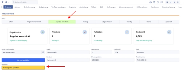 Wir schließen nun die Angebotsmaske und kehren zum Bereich „Projekte“ zurück. Dort sehen wir, dass sich der Status des Projekts von „Offen“ zu „Angebote verschickt“ geändert hat. Zusätzlich ist die Projektart nun ausgefüllt, da wir zuvor bei der Auswahl der Angebotsvorlage in „Angebote“ eine entsprechende Projektart ausgewählt haben.