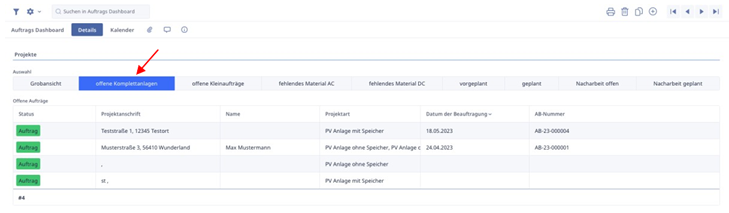 · Offene Komplettanlagen zeigt alle Projekte, die den Status „Auftrag“ haben, keinen Montagetermin aufweisen und bei denen die Auftragsart als „Großauftrag“ festgelegt wurde.