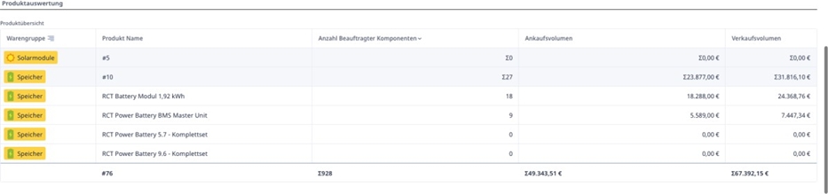 Im letzten Abschnitt des Lead-Dashboards haben wir die Produktauswertung im Unternehmen. Hier kann mit einem Klick auf eine Warengruppe angezeigt werden, welche Produkte im ausgewählten Zeitraum beauftragt wurden sowie das Ankaufsvolumen und das Verkaufsvolumen.