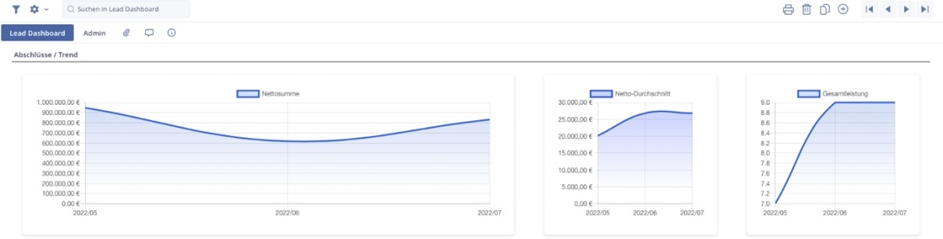 Die Tabelle Lead Dashboard, das nur für den Admin und den Geschäftsführer sichtbar ist, zeigt einen Überblick auf den Auftragsvolumen, die Anzahl der Aufträge, die Gesamtleistung und die durchschnittliche Auftragsdauer für einen bestimmten Zeitraum. Der Betrachtungseitraum kann in den Datumsfeldern genauer spezifiziert werden.