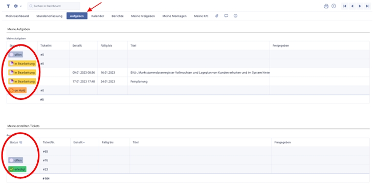 Der nächste Karteireiter im Dashboard ist der Bereich „Aufgaben“. Hier werden zwei Abschnitte unterschieden: „Meine Aufgaben“ und „Meine erstellten Tickets“. Im Abschnitt
