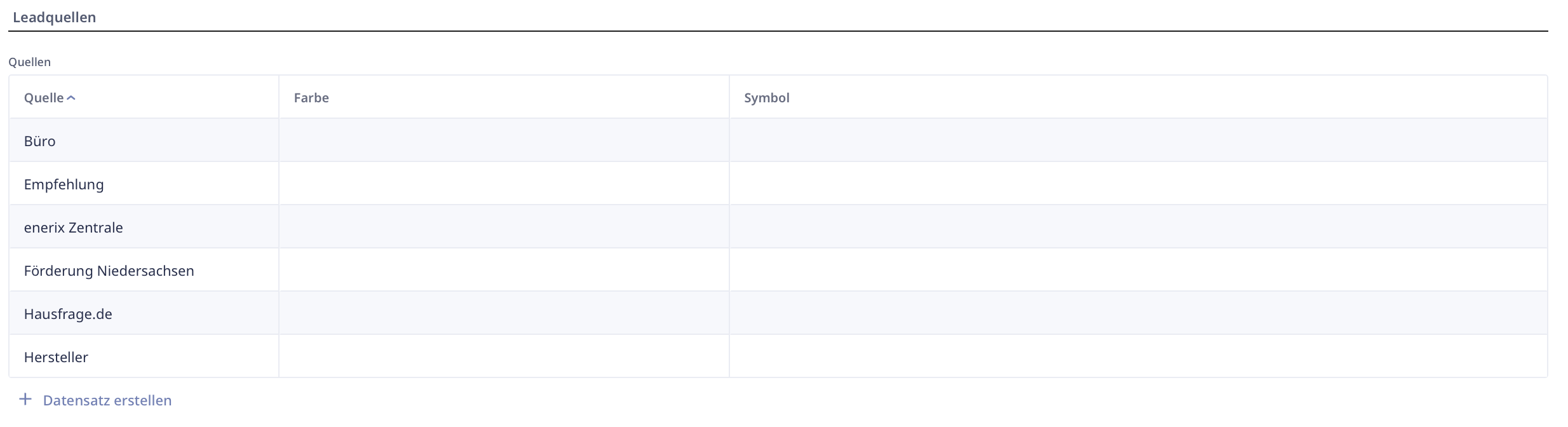 Hier werden die Quellen erfasst, aus denen Leads stammen können.&#x20;