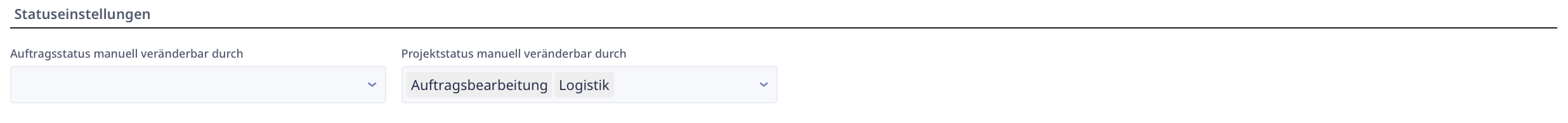 Hier finden Sie die Statuseinstellungen. Dort können Sie einerseits einstellen, welche Abteilungen den Status von Aufträgen manuell verändern dürfen. Andererseits können Sie dort hinterlegen, welche Abteilungen den Status von Projekten ändern dürfen.&#x20;