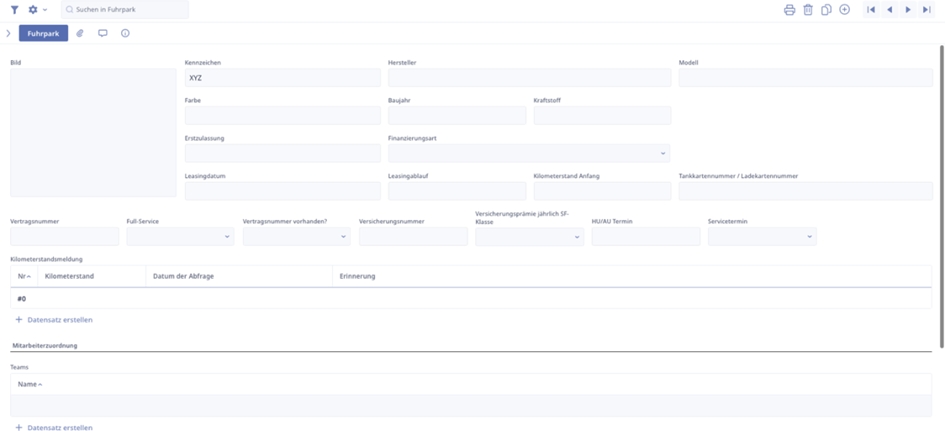 Wenn wir im Fuhrpark einen neuen Datensatz erstellen, haben wir die Möglichkeit, die Stammdaten des jeweiligen Fahrzeugs anzugeben. Dazu gehören Informationen wie das Kennzeichen, der Hersteller, das Modell, der Kraftstofftyp usw. Zusätzlich können wir den aktuellen Kilometerstand des Fahrzeugs tabellarisch in der Kilometerstandanmeldung verfolgen. Des Weiteren haben wir die Option, das Fahrzeug einem bestimmten Mitarbeiter zuzuordnen.