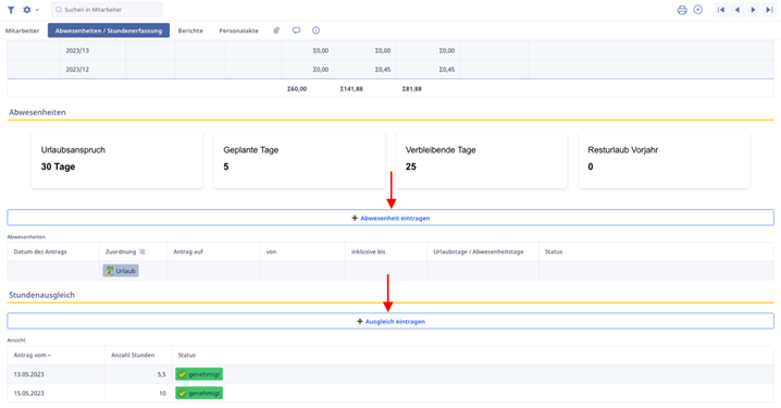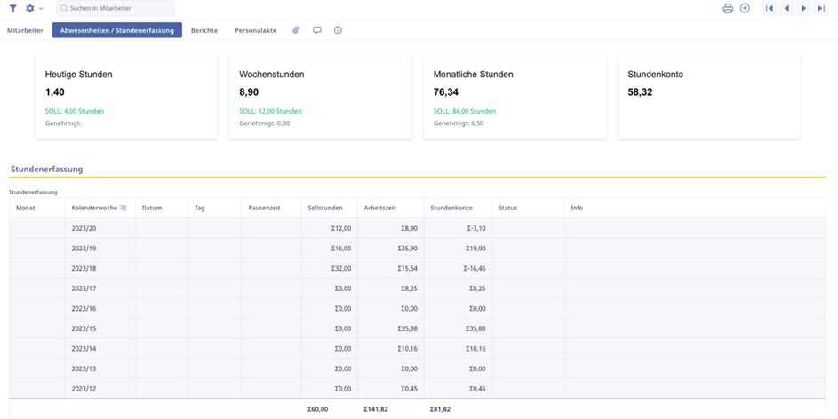 In dem Karteireiter „Abwesenheiten/Stundenerfassung“ haben wir ein Abbild des Dashboards. Hier hat das Personalmanagement eine umfassende Übersicht über die Stundenerfassung, Abwesenheiten und den Stundenausgleich des jeweiligen Mitarbeiters.