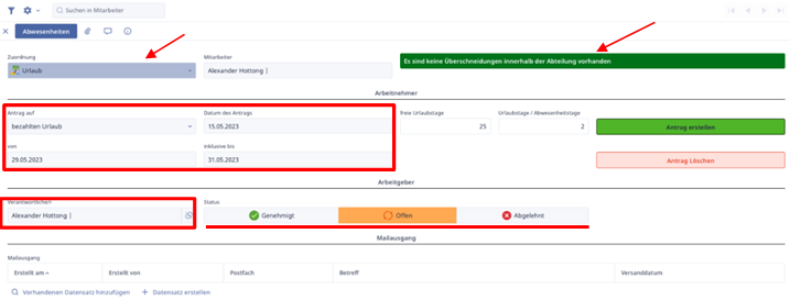 Wenn wir auf „Abwesenheit eintragen“ klicken, öffnet sich eine neue Maske, in der wir die erforderlichen Felder ausfüllen können. Zur Demonstration wählen wir die Option „Urlaub“ in der Zuordnung. Anschließend können wir den Urlaub genauer spezifizieren, indem wir angeben, um welchen Urlaubstyp es sich handelt. Sobald der Zeitraum für den beantragten Urlaub festgelegt ist, erscheint eine Infonachricht, die uns darüber informiert, ob es innerhalb der Abteilung eine Überschneidung mit anderen Abwesenheiten gibt oder nicht. Am Ende kann die verantwortliche Person dann auswählen, ob die Abwesenheit genehmigt wird oder nicht. Die verantwortliche Person ist immer die diejenige, die wir in der Mitarbeiterkarteireiter zugewiesen haben.