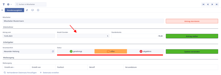 Wenn wir auf „Ausgleich eintragen“ klicken, öffnet sich ebenfalls eine neue Maske und tragen die Anzahl der Stunden, die wir dem Mitarbeiter ausgleichen möchten. Sobald die Anzahl eingetragen wurde, setzen wir dann auch hier den Status auf genehmigt.