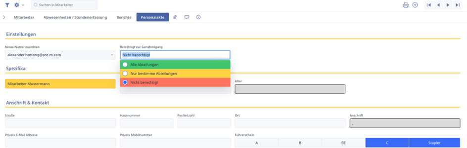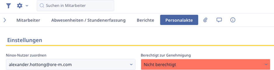 In der Mitarbeitertabelle gibt es auch den Karteireiter „Personalakte“, in dem private Informationen/Stammdaten des Mitarbeiters eingetragen werden können. Hier können auch die verschiedenen Rechte für alle Personalprozesse hinterlegt werden. Dafür ist der Einstellungen-Abschnitt von großer Bedeutung. Als erstes muss der Mitarbeiterdatensatz an seinem Ninox-Nutzer zugeordnet sein und können dann auswählen, welche Berechtigung diese Person zur Genehmigung hat.