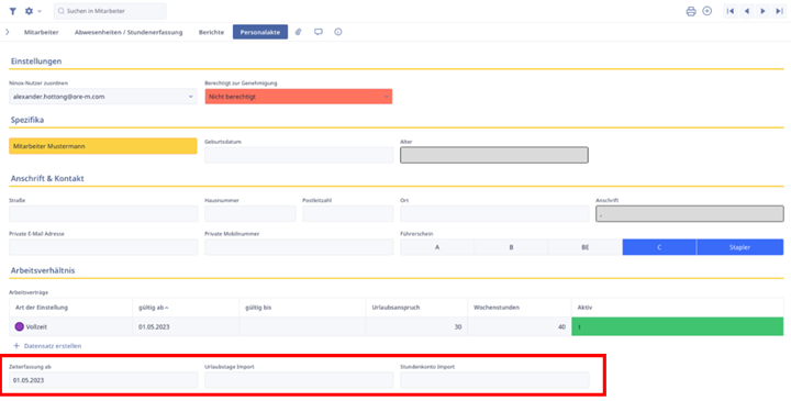 Der nächste wichtige Abschnitt ist der Arbeitsverhältnis-Abschnitt. Hier erfolgt die Stundenerfassung in Verbindung mit den jeweiligen mit den jeweiligen Arbeitsverträgen. Außerdem haben wir die Möglichkeit anzugeben, ab wann die Zeiterfassung starten soll. Des Weiteren können wir die Urlaubstage sowie das Stundenkonto vom vorherigen System importieren.