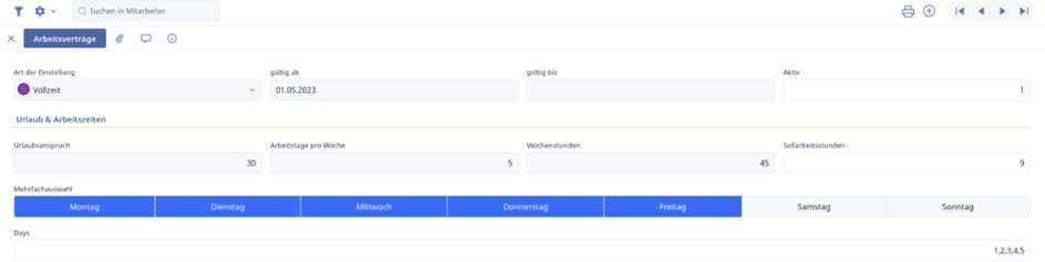 Wenn wir bei Arbeitsverträgen einen neuen Datensatz erstellen, öffnet sich eine neue Maske, in der wir den Art der Einstellungen auswählen können und festlegen, wie lange der Arbeitsvertrag gültig sein soll. Anschließend tragen wir den Urlaubsanspruch, die Arbeitstage pro Woche, die Wochenstunden und die Tage ein, an denen der Mitarbeiter arbeiten muss. Dadurch wird automatisch die Sollarbeitsstunden berechnet und ausgegeben.