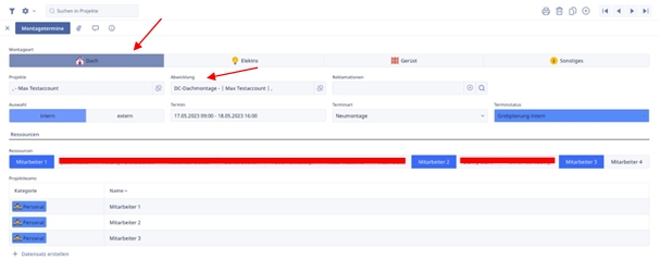 Dadurch erscheint eine neue Maske, wo wir den Montagetermin festlegen können. Durch die Auswahl der Montageart wird automatisch die entsprechende Abwicklung verlinkt. Anschließend füllen wir die restlichen Felder aus. Hierbei passt sich die Auswahl der Mitarbeiter automatisch an die gewählte Montageart an. Aus den Auswahl der Mitarbeiter können wir dann ein passendes Montageteam zusammenstellen.