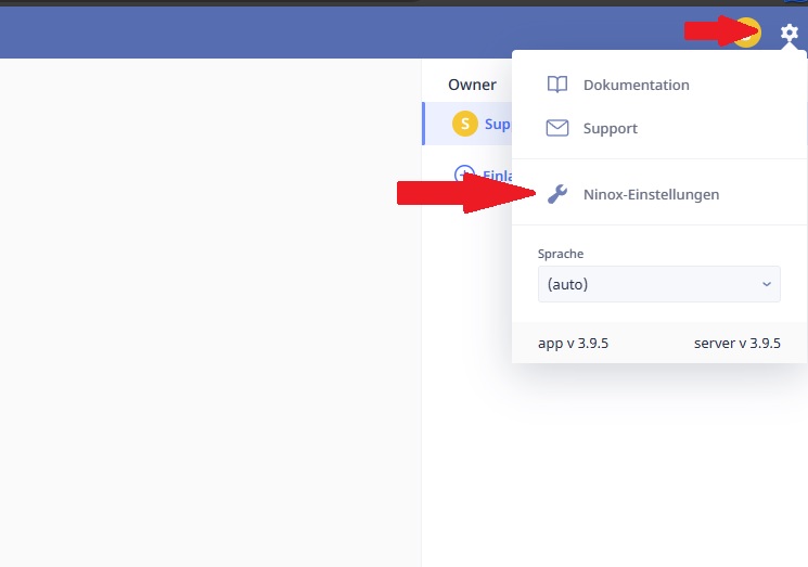 Klicken Sie auf das Zahnrad oben rechts auf das Zahnrad, da sollten Sie nun die Option Ninox Einstellungen sehen.