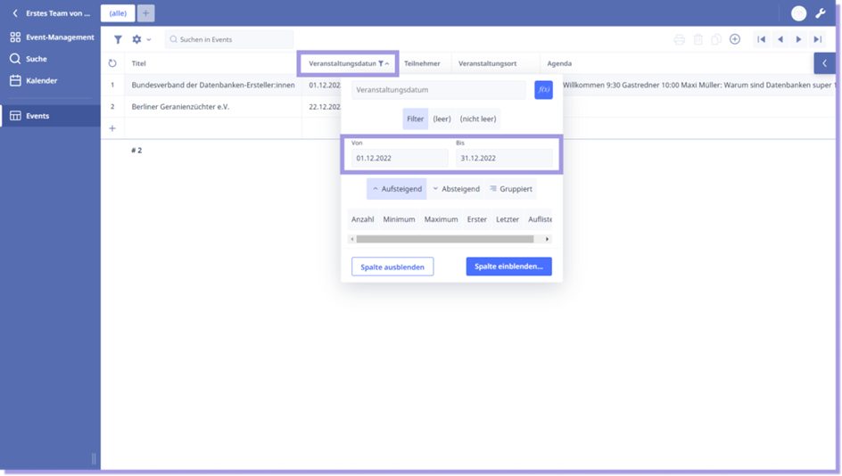 Wenn Sie in einer Spalte nach einem bestimmten Wert suchen, geben Sie Ihre Suche in das Filter ein und die Ergebnisse werden Ihnen angezeigt. Hier im Beispiel haben wir nach Veranstaltungen im Dezember 2022 gesucht.