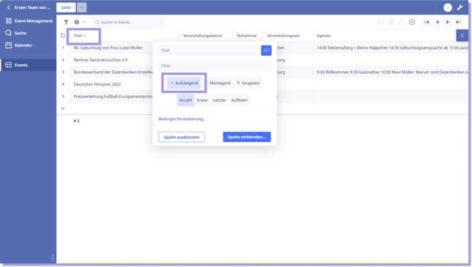 Klicken Sie in unserem Beispiel auf Titel und Sie können die Tabelle alphabetisch ordnen, indem Sie auf