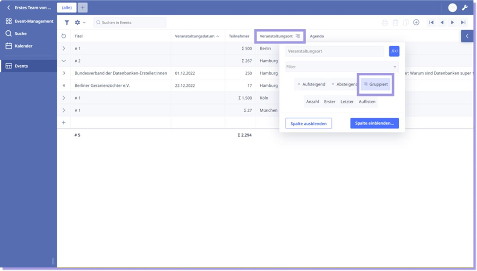Gruppieren Sie bei Veranstaltungsort die Einträge und Sie erhalten einen Überblick darüber, wie viele und welche Veranstaltungen je Raum gebucht sind.