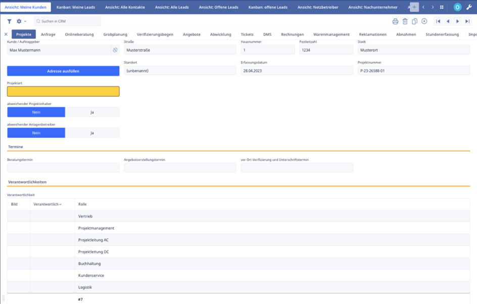 Im ersten Reiter des Projekts werden die Kerndaten wie die Projektanschrift, das Erfassungsdatum, die Projektnummer, der Auftraggeber, der Projektstatus etc. des jeweiligen Projekts erfasst und ausgegeben. Ebenso haben wir die Möglichkeit, unsere Beratungstermine und die Projektverantwortlichkeiten einzutragen.