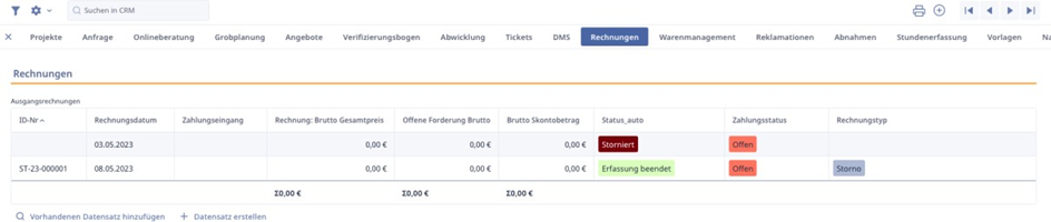 Innerhalb des Karteireiters „Rechnungen“ finden wir die Rückverknüpfung zu den Ausgangs - & Eingangsrechnungen unseres Projekts. Hier werden uns alle Rechnungen angezeigt, die wir innerhalb eines Projekts erstellt haben und welche Eingangsrechnungen wir auf dieses Projekt gebucht haben. Wie bei den vorherigen Rückverknüpfungen können wir hier projektspezifische Ausgangs -& Eingangsrechnungen anlegen und bearbeiten.