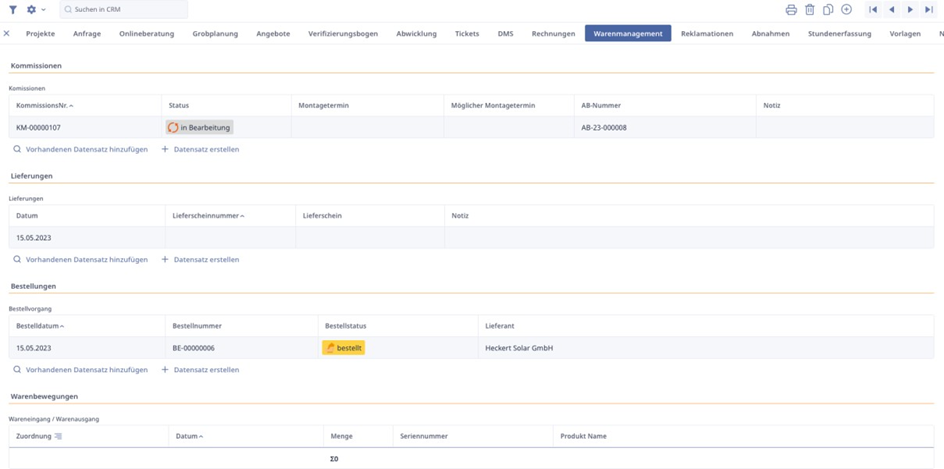 Innerhalb des Reiters „Warenmanagement“ werden uns alle relevanten Prozesse zur Warenwirtschaft ausgewiesen. Hier finden sich die Rückverknüpfungen zu den Kommissionen, Lieferungen, Bestellungen und den Warenbewegungen. Diese Ebene dient dazu, jederzeit den Überblick über die Projektspezifischen Warenbewegungen und Warenwirtschaftsprozesse zu gewährleisten.