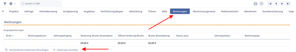 Wir empfehlen Rechnungen in der Projektebene zu erstellen, indem wir auf den Karteireiter „Rechnungen“ gehen und dort einen neuen Datensatz erstellen.