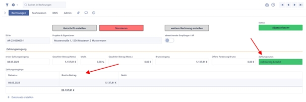 Wir schließen die Maske und sehen, dass die Felder im Abschnitt nun befüllt sind und der Zahlungsstatus von „offen“ auf „vollständig bezahlt“ gewechselt wurde.