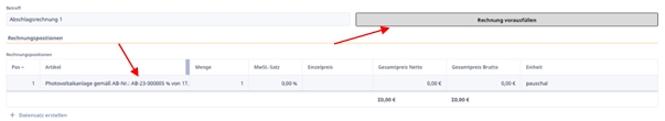 Nachdem die relevanten Felder ausgefüllt sind, können wir auf den Button „Rechnung vorausfüllen“ klicken und die Auswahl bestätigen. Dadurch wird ein neuer Datensatz in den Rechnungspositionen erstellt, auf den wir dann draufklicken.