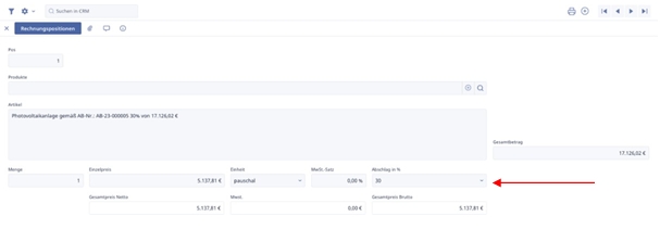 Dabei öffnet sich eine neue Maske Rechnungspositionen, in der wir den Gesamtbetrag von unserem erstelltem Angebot sehen. Hier müssen wir nur den „Abschlag in %“ ausfüllen. Dieser bezieht sich auf die Zahlungsbedingungen unseres Angebots (30%/60%/10%). Wir wählen somit einen Abschlag von 30% aus. Einzelpreis, Gesamtpreis Brutto & Netto passen sich entsprechend an.