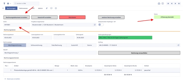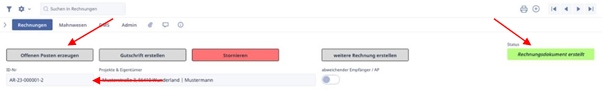 Wenn alle Angaben korrekt sind, können wir auf den Button „Rechnungsdokument erstellen“ klicken. Es erscheint eine Pop-up Nachricht, die wir bestätigen und die Rechnung wird im DMS generiert. Nun sehen wir, dass der Button „Rechnungsdokument erstellen“ durch den Button