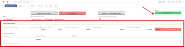 Wenn wir auf den Button „Offene Posten erzeugen“ klicken, ändert sich der Status der Rechnung erneut und der Abschnitt „Zahlungseingang“ wird sichtbar. In diesem Abschnitt können wir die Zahlungseingänge des Kunden verfolgen und eingehende Zahlungen eintragen.