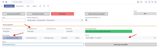 Dabei öffnet sich die Rechnungsmaske und sehen, dass das Projekt und der Eigentümer für die Rechnung automatisch verknüpft sind. Wir passen das Leistungsdatum an das Rechnungsdatum an und wählen dann den Rechnungstyp „Abschlagsrechnung“ aus.