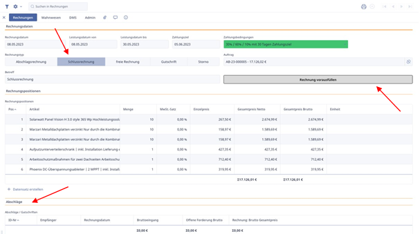 Daraufhin öffnet sich noch eine Rechnungsmaske. Wir tragen das Leistungsdatum von und bis ein, ändern den Betreff und wählen bei Rechnungstyp „Schlussrechnung“. Dadurch wird der Abschläge-Abschnitt sichtbar. Anschließend klicken wir auf „Rechnung vorausfüllen und sehen, dass alle Artikel, die für das Projekt berechnet wurden, erneut angezeigt werden.