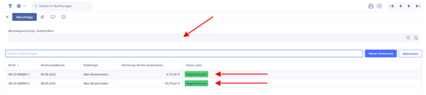 Nachdem die finale Zahlung eingegangen ist, erstellen wir wie zuvor einen neuen Datensatz und bestätigen den Zahlungseingang. Anschließend schließen wir die Maske und verlassen die Rechnungsansicht. Dort sehen wir alle Rechnungen in der Projektebene, die für den Kunden erstellt wurden, sowie den Status der einzelnen Rechnungen.