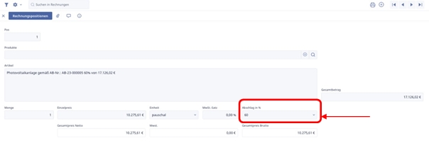 Daraufhin öffnet sich wieder eine Rechnungspositionenmaske und passen auch hier nur den Abschlag in % an.