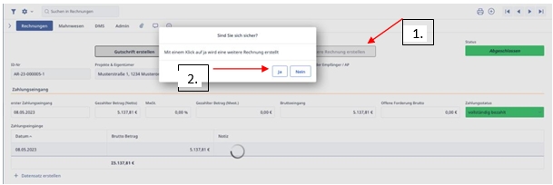 Wir schließen die Maske und befolgen die gleichen Schritten wie bei der ersten Abschlagsrechnung. Anschließend klicken wir erneut bei Zahlungseingänge auf Datensatz erstellen, um den Zahlungseingang für die zweite Abschlagsrechnung zu bestätigen. Schließlich erstellen wir unsere Schlussrechnung und klicken erneut auf „weitere Rechnung erstellen“.