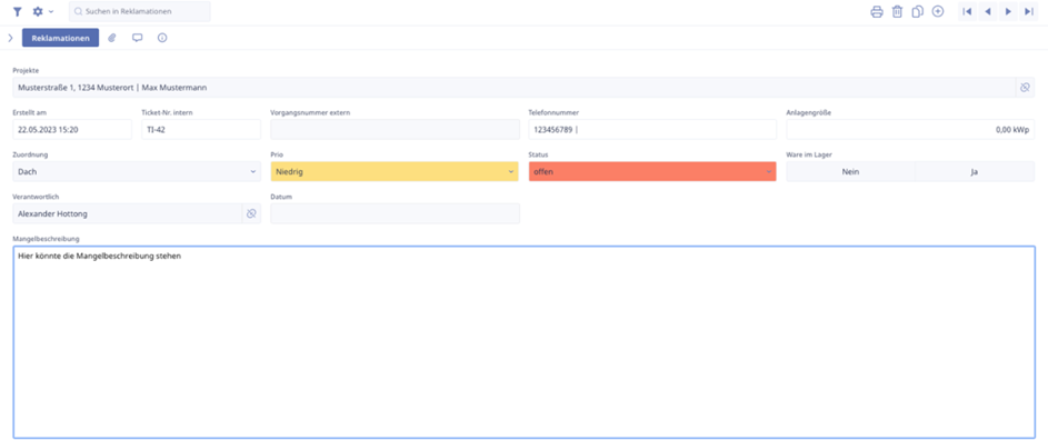 Bei der Erstellung einer Reklamation wird in der Regel automatisch das zugehörige Projekt verknüpft, wenn die Reklamation von der Projektebene aus erstellt wird. Dabei wird automatisch eine interne Ticket-Nr. generiert. Die Telefonnummer und die Anlagengröße (falls vorhanden) werden ebenfalls vom zugehörigen Projekt übernommen. Anschließend haben wir die Möglichkeit, die Zuordnung für die Reklamation festzulegen und die Priorität der Reklamation auszuwählen. Falls ein externer Service vorhanden ist, können wir die Vorgangsnummer angeben. Im letzten Schritt können wir eine detaillierte Mangelbeschreibung verfassen, in der das spezifische Problem beschrieben wird.