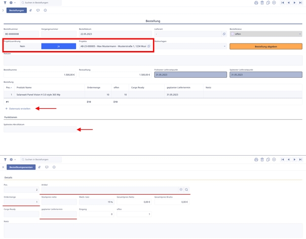 haben wir die Möglichkeit, unseren Lieferanten für die Bestellung auszuwählen. Wenn die Projektzuordnung aktiviert ist, besteht auch die Option, die Bestellung einem spezifischen Projekt zuzuordnen. In der verknüpften Tabelle „Bestellung“ können wir einen neuen Datensatz erstellen, woraufhin sich eine neue Maske (Bestellkomponenten) öffnet. Hier können wir das gewünschte Produkt im Feld „Artikel“ auswählen, die gewünschte