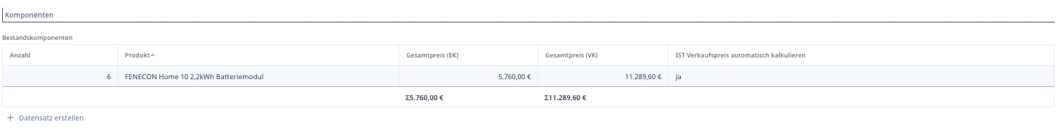 Für jede Komponenten Legen wir nun einen einzelnen Datensatz an, tragen die Menge ein und Verlinken den gewünschten Artikel aus dem Produktkatalog.