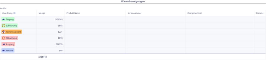 Unterhalb des Lagervermögens befindet sich eine tabellarische Ansicht der Warenbewegung, die es ermöglicht, den vollständigen Verlauf einer Zuordnung nachzuverfolgen. In dieser Ansicht werden umfassende Informationen über den Verlauf der Warenbewegung angezeigt, darunter das Datum, die betroffenen Produkte, die Mengen sowie die Seriennummer und die Chargennummer des Produkts.