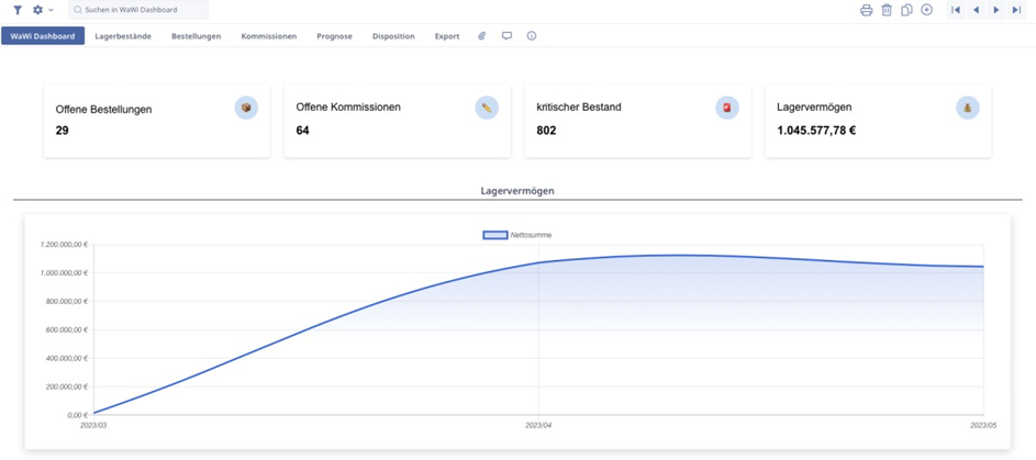 In der Tabelle „WaWi Dashboard“ erhalten wir einen Einblick über die Anzahl der offenen Bestellungen und Kommissionen, den kritischen Lagerbestand (wenn der IST-Lagerbestand kleiner oder gleich der Mindestlagermenge ist) und das Gesamtlagervermögen. Das Lagervermögen wird auch graphisch dargestellt, um einen visuellen Überblick zu ermöglichen.