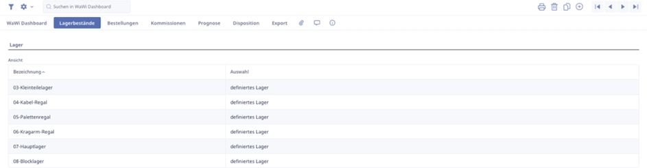 In der Karteireiter „Lagerbestände“ erhalten wir eine tabellarische Übersicht über das gesamte Lager. Hier werden die Lagerbestände zusammen mit ihrer entsprechenden Bezeichnung und Lagerart dargestellt. Diese Übersicht ermöglicht es uns, einen vollständigen Einblick in unseren Lagerbestand zu erhalten und die verschiedenen Lagerpositionen zu verwalten.